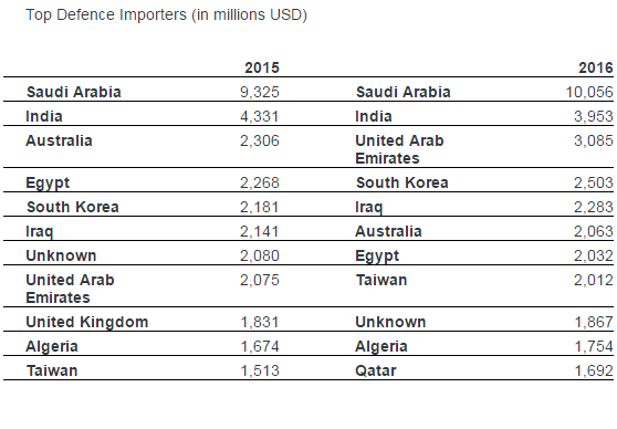 En termes d'importations, c'est le Moyen-Orient qui est en tête du palmarès, avec l'Arabie Saoudite en première position (9,3 milliards de dollars d’importations), devant l'Inde (4,3 milliards), l'Australie (2,3 milliards), l'Egypte (2,2 milliards) et la Corée du Sud (2,18 milliards).