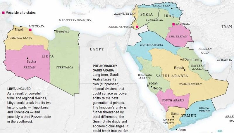 Si le Maroc n’était pas concerné par une partition de son territoire, la carte en question montrait comment 5 pays arabes (Arabie Saoudite, Irak, Syrie, Yemen, Libye) pouvaient éclater en 14 entités.