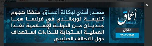 Selon l'agence Amaq, un organe de propagande de Da'ech, le groupe jihadiste a affirmé que cette attaque avait été exécutée par deux de ses "soldats". L'assassinat d'un prêtre dans une attaque terroriste est une première en France.