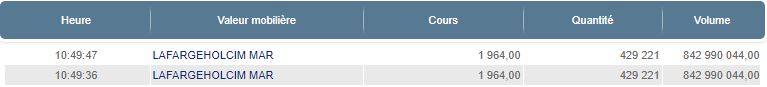 Celle-ci porte sur la transaction de deux blocs, composés chacun de 429.221 actions échangées à 1.964 DH, pour un volume total de 1,6 milliards de DH.