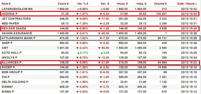 Les mouvements les plus importants concernent les gros volumes. Les immobilières cèdent toutes du terrain: à 10H55, Alliances cédait 9,98% et était encore réservée à la baisse. Addoha baissait de 1,07% et Résidence Dar Essaâda de 4,17%.