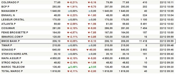 Ce matin, la plupart des transactions et des valeurs sont à la baisse (tableau ci-dessous).