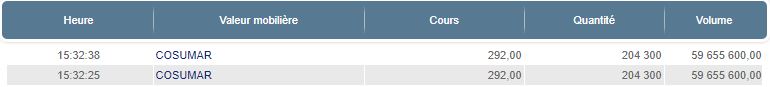 S’agissant des plus fortes volumétries du marché central, celles-ci concernent les valeurs suivantes: