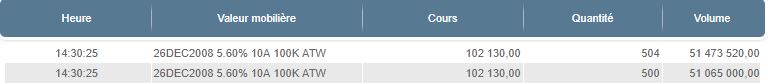 Ce jeudi vers 14h30, 1.004 obligations de la valeur Attijariwafa Bank ont été échangées sur le marché central au cours de 102.130,00 DH, soit un montant total de 102,5 MDH. (Voir tableau ci-dessous)