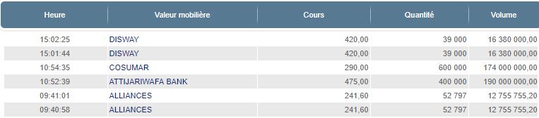 Le marché de blocs a été animé par l’échange de plus d’un million d’actions, qui concernent notamment Disway, Cosumar, Attijariwafa Bank et Alliances. (voir tableau ci-dessous):