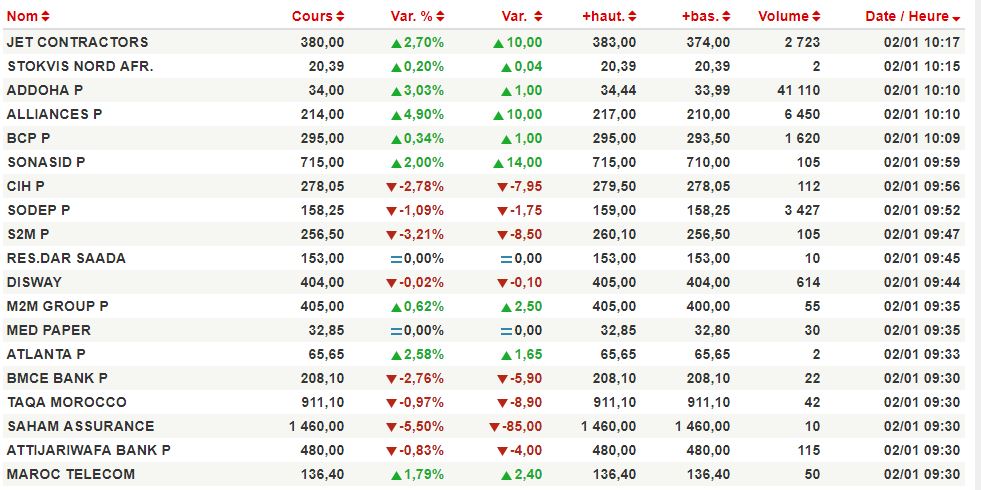 A 10h31, les indices MASI et MADEX avaient cédé respectivement 0,02% à 12.385,85 points et 0,03% à 10.097,69 points, pour un petit volume global des transactions de 5,3 MDH.