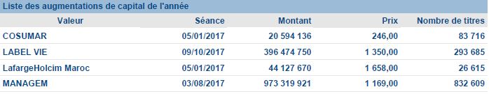 Nous rappelons que l’année 2017 n’a connu aucune introduction en bourse. Toutefois, 5 sociétés ont procédé à l’augmentation de leur capital : Cosumar (+20,5 MDH) ; Label Vie (396,4 MDH) ; LafargeHolcim Maroc (+44,1 MDH) ; Managem (973,3 MDH). (Voir tableau ci-dessous)