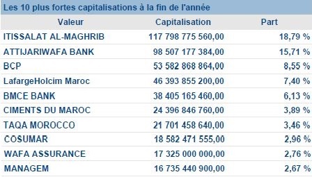 Selon le rapport annuel de la Bourse des Valeurs de Casablanca, la valorisation globale de la Bourse de Casablanca s’est établie à 626,9 MMDH. 5 valeurs ont en raflé plus de 56%. Il s’agit notamment de Itissalat Al-Maghrib (117,7 MMDH); Attijariwafa Bank (98,5 MMDH) ; BCP (53,5 MMDH) ; Lafarge Holcim Maroc (46,3 MMDH) ; et BMCE Bank (38,4 MMDH). (Voir tableau ci-dessous)
