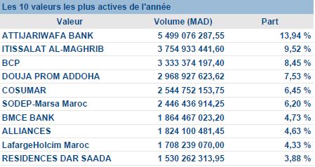 > Attijariwafa Bank (13,94% du volume global) : 12.278.300 actions de AWB ont été échangées au cours de 2017, en totalisant un volume de 5,4 MMDH ;
