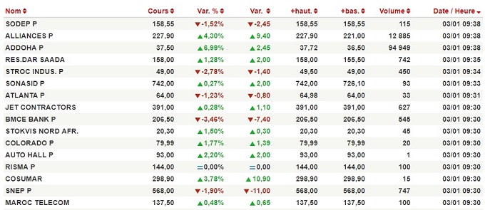 Addoha a progressé de 6,99% après avoir échangé 94.949 titres pour se situer à 37,5 DH. Celle-ci est suivie par Alliances dont le cours a augmenté de 4,3% suite à l’échange de 12.885 titres. Quant à Résidences Dar Saada, celle-ci a avancé de 1,28% après avoir échangé 742 titres pour s’établir à 158 DH.
