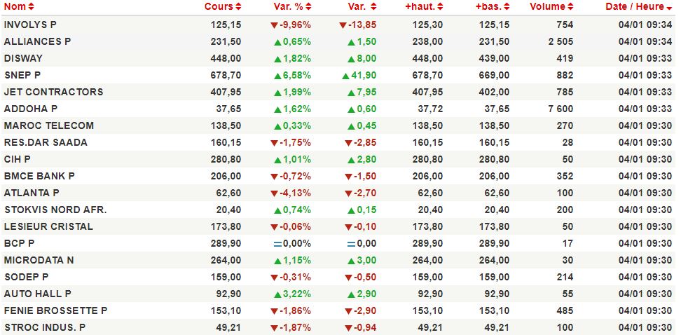 A 09h44, les indices MASI et MADEX avaient cédé respectivement 0,44% à 12.454,22 points et 0,48% à 10.160,55 points, pour un petit volume de 1,5 MDH, porté en grande partie par Snep (548.799,00 DH) et Alliances (286.790,00 DH).