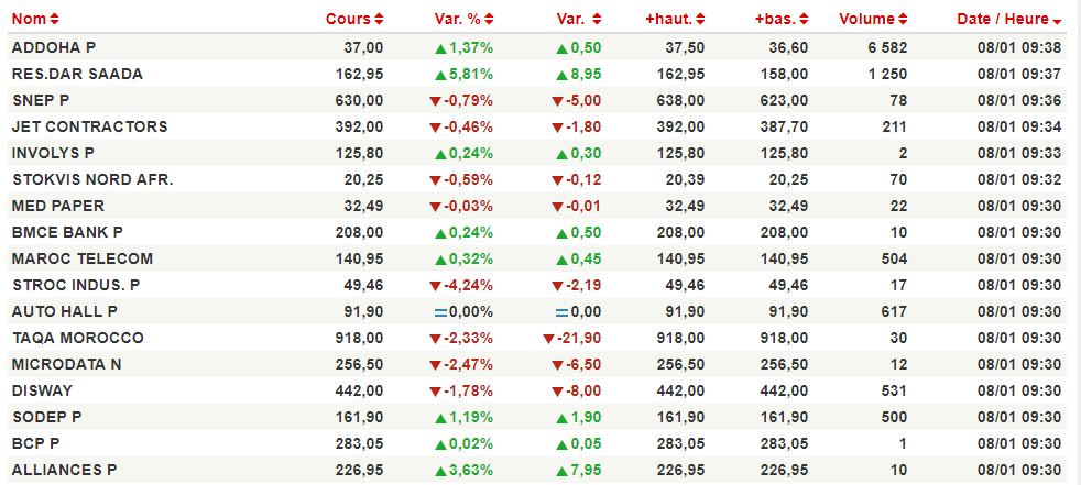 Addoha a avancé de 1,37% pour s’établir à 37,00 DH après l’échange de 6.582 actions. Résidences Dar Saada, quant à elle, s’est appréciée de 5,81% à 162,95 DH après l’échange de 1.250 actions. S’agissant de Maroc Telecom, celle-ci a rebondi de 0,32% à 140,95 DH après l’échange de 504 titres.