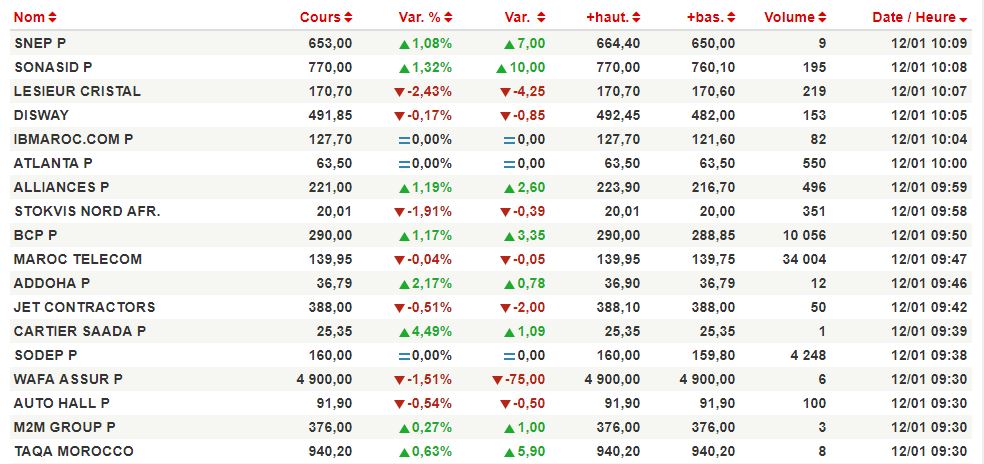 A 10h18, les indices MASI, MADEX et FTSE CSE Morocco 15 affichaient respectivement 0,02% à 12.540,92 points, 0,02% à 10.221,77 points et 0,33% à 11.758,56 points.