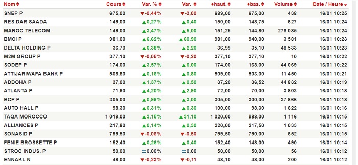 Maroc Telecom arrive en tête des plus fortes hausses avec une progression du cours de 3,47% pour se situer à 149 DH suite à l’échange de 276.085 titres.Quant à Delta Holding, le cours a enregistré une hausse de 6,38% après l’échange de 48.533 titres. Par ailleurs, Addoha a progressé de 1,37% après avoir échangé 44.832 titres pour se situer à 37 DH.