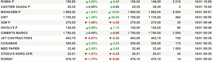 A 10h28, les deux indices MASI et MADEX affichaient respectivement +1,08% à 13.001,74 points et +1,17% à 10.610,63 points.