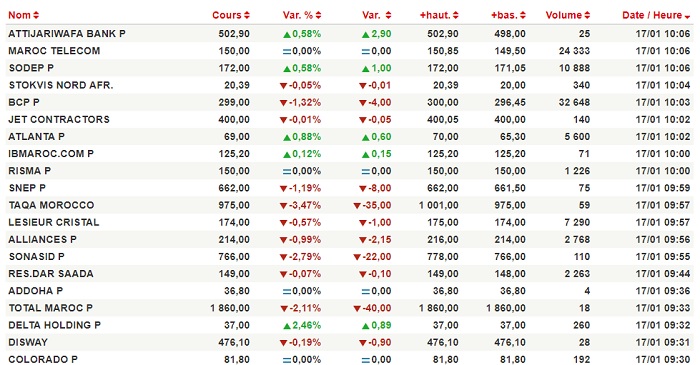 Maroc Telecom arrive en tête des plus fortes hausses avec une progression du cours de 3,47% pour se situer à 149 DH suite à l’échange de 276.085 titres.Quant à Delta Holding, le cours a enregistré une hausse de 6,38% après l’échange de 48.533 titres. Par ailleurs, Addoha a progressé de 1,37% après avoir échangé 44.832 titres pour se situer à 37 DH.