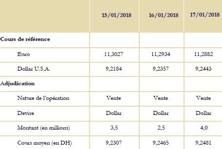 Au cours de cette période (15 au 17 janvier), Bank Al Maghrib affirme avoir procédé à trois opérations de vente de devises pour un montant total de 10 millions de dollars, avec un cours moyen de 9,2416 dirhams.