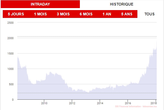 Le cours de HPS a franchi, pour le première fois, la barre de 2.000 DH, ce mardi 23 janvier depuis 10 ans. A 13h37, le cours de la valeur technologique s'établissait à 2.050 DH