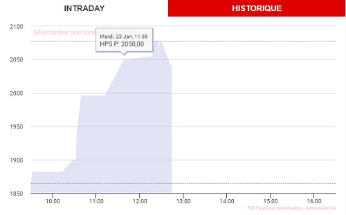 Le graphique ci-dessous, généré par LeBoursier, présente l'évolution du cours de HPS pour la matinée de ce mardi 23 janvier. A 11h38, la première cotation en-dessus de 2.000 DH a eu lieu.