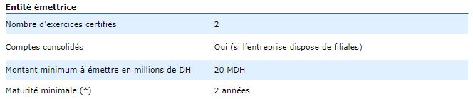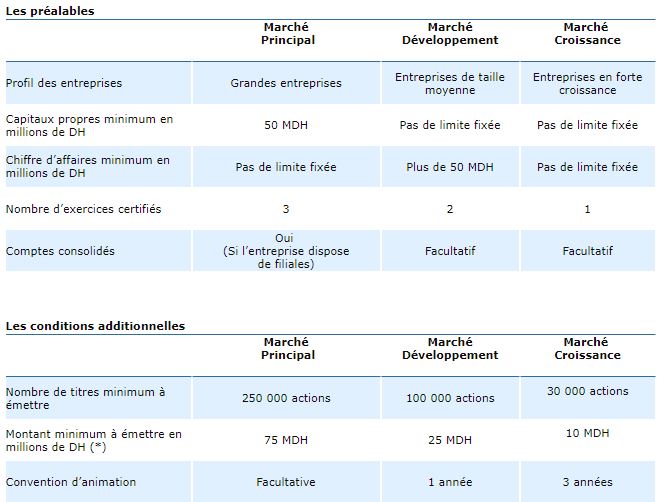 La bourse de Casablanca définit, quant à elle, les conditions d’admission à la cotation, à travers les tableaux qui suivent: