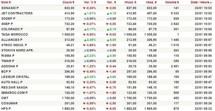 Jet Contractors a gagné 1,01% après avoir échangé 5.333 titres sur le marché, pour se situer à 413,9 DH. Alliances, quant à elle, a avancé de 2,4% suite à l'échange de1.440 actions pour s'établir à 213 DH. Du côté de Colorado, le cours de celle-ci a affiché une variation positive de 0,17% après l'échange de 301 titres pour se situer à 87,95 DH.