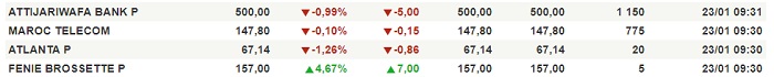 La Snep a vu son cours baisser de 0,07% suite à l'échange de 3.542 actions pour s'établir à 722,2 DH. Quant à Addoha, celle-ci a reculé de 1,22% après avoir échangé 2.451 titres pour se situer à 35,5 DH. Par ailleurs, Attijjariwafa Bank a cédé 0,99% après l'échange de 1.150 titres pour se situer à 500 DH.