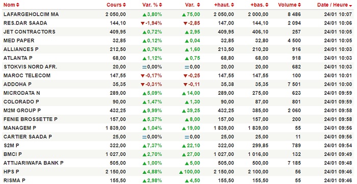 LafargeHolcim a progressé de 3,8% suite à l'échange de 8.486 titres pour s'établir à 2.050 DH. Quant à Attijariwafa Bank, le cours de celle-ci a crû de 1% après avoir échangé 7.185 actions pour se situer à 505 DH. Par ailleurs, M2M a enregistré une augmentation de 9,99% en échangeant 2.060 titres pour se situer à 432,25 DH.
