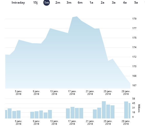 Le graphique ci-dessous illustre l'évolution du cours boursier d'Apple pendant le mois de janvier 2018: