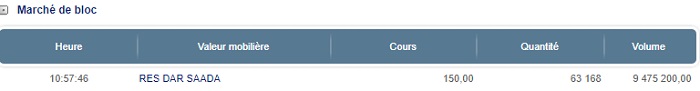 Concernant le volume global des transactions, celui-ci a atteint 151,6 MDH dont 9,5 MDH ont été échangés sur le marché de blocs par Résidences Dar Saada comme suit: