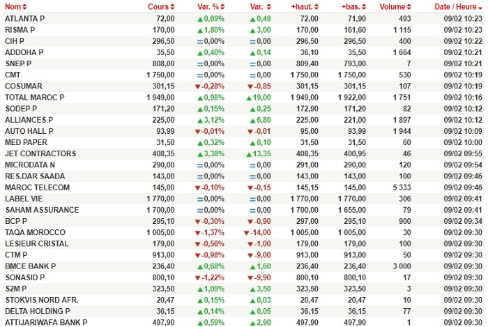 BMCE Bank a progressé de 0,68% après avoir échangé 3.000 actions pour s'établir à 236,4 DH. Alliances, quant à elle, a gagné 3,12% après avoir échangé 1.897 titres pour se situer à 225 DH. Par ailleurs, Total Maroc a avancé de 0,98% suite à l'échange de 1.751 actions pour s'établir à 1.949 DH.