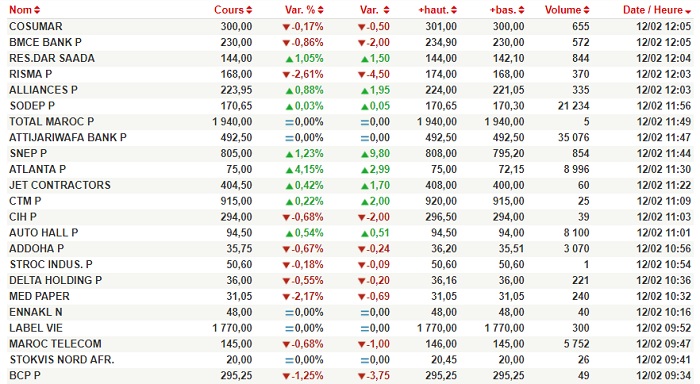 Sodep-Marsa Maroc a progressé de 0,03% suite à l'échange de 21.234 actions pour s'établir à 170,65 DH. De l'autre côté, Atlanta a gagné 4,15% en échangeant 8.996 actions, pour s'établir à 75 DH. Auto Hall, quant à elle, a avancé de 0,54% après avoir échangé 8.100 titres pour se situer à 94,5 DH.