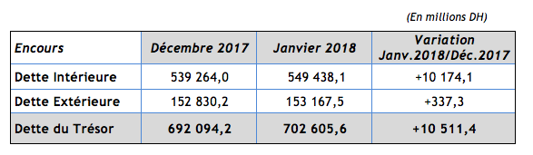 Ces chiffres montrent une augmentation de l'encours de la dette du trésor qui s'établit à 702.605,6 MDH contre 692.094,2 MDH à fin Décembre 2017; soit une augmentation de 10511,4 MDH