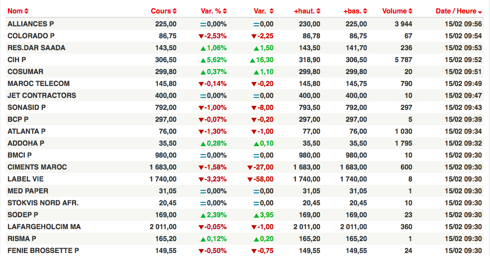 CIH a avancé de 6,13% à 308 DH suite à l'échange de 5.787 actions. Résidences Dar Saada, gagne 1,6% à 143,5 DH après une échange 236 titres. Quant à Cosumar, elle progresse de 0,37% pour s’établir à 299,80 DH après l’échange de 20 titres.