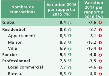 Pour leur part, les transactions ont connu une baisse importante de 18,7%, après une hausse de 27,7% en 2016. Cette évolution reflète la diminution des ventes de toutes les catégories d’actifs avec des taux de 18,9% pour le résidentiel, de 30,9% pour les terrains et de 7,3% pour les biens à usage professionnel.