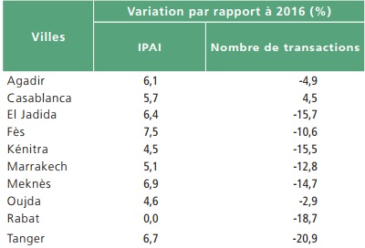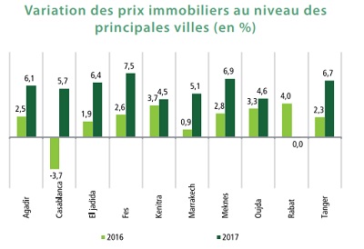> Plus en détail, au niveau de Casablanca, après une baisse de 3,7% en 2016, les prix ont connu une progression de 5,7%, reflétant des augmentations pour les appartements et les biens à usage professionnel de 6,9% et de 9% respectivement. En revanche, les prix des terrains ont accusé une baisse de 4,4%.