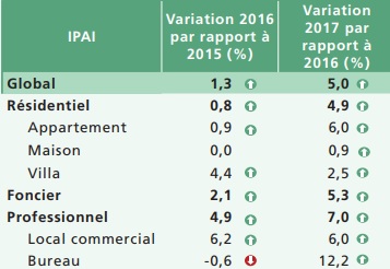 En 2017, les prix des actifs immobiliers ont enregistré une hausse de 5%, après celle de 1,3% en 2016, avec des augmentations de 4,9% pour les biens résidentiels, de 5,3% pour les terrains et de 7% pour les biens à usage professionnel, selon les données de BAM (voir tableau ci-dessous):