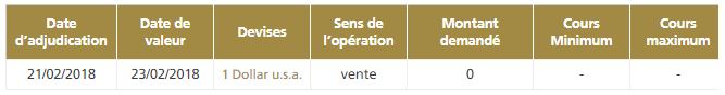 A l’issue de la séance d’adjudication d'aujourd'hui, Bank Al-Maghrib n’a servi aucun montant en devises. (Voir tableau ci-dessous)
