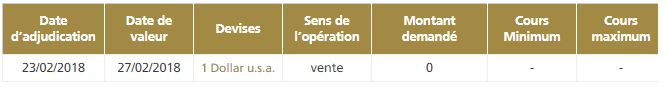 A l’issue de la séance d’adjudication d'aujourd'hui, Bank Al-Maghrib n’a servi aucun montant en devises. (Voir tableau ci-dessous)