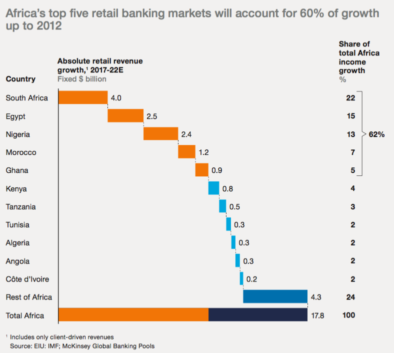 Le marché bancaire Marocain a enregistré un taux de croissance de 5% par an ou plus de 2012 à 2017, et devrait générer une croissance de 1,2 milliards de dollars d'ici 2022. Mais la plus forte croissance sera en Afrique du Sud, qui représentera 4 milliards de dollars, soit bien plus d'un cinquième de la croissance des banques de détail africaines d'ici 2022. Les autres principaux marchés en croissance sont l'Égypte (2,5 milliards de dollars), le Nigeria (2,4 milliards de dollars), le Ghana (0,9 milliards de dollars), et le Kenya (0,8 milliards de dollars).