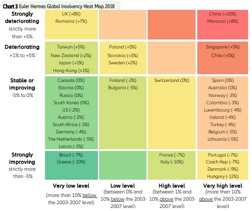 Avec le Maroc, la Chine (+10%), le Royaume-Uni (+8%), la Roumanie (+7%), et la Pologne (+5%) enregistreront les plus fortes hausses de défaillances en 2018. A l'échelle mondiale, les défaillances d’entreprises ont progressé de +1% en 2017 mais devront légèrement reculer de -1% en 2018.