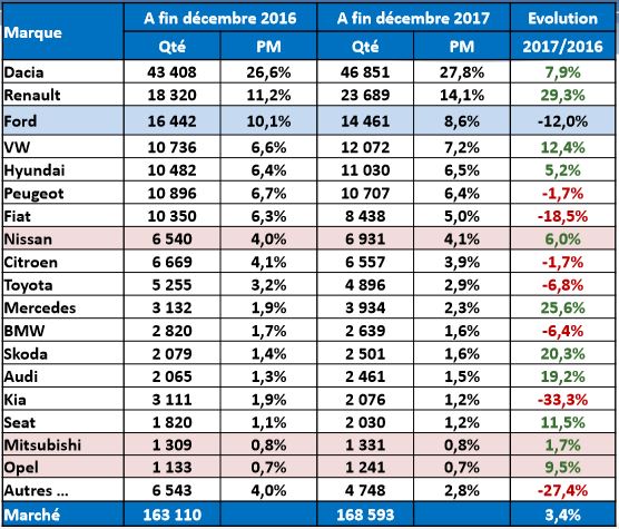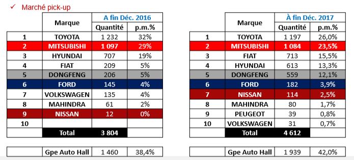 Sur le marché pick-up, Ford a maintenu son classement (6e position) malgré la légère baisse de sa PDM qui s’est établi à 3,9% en 2017 (182 véhicules vendus) contre 4% en 2016 (145 véhicules vendus).