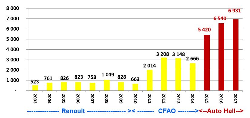 Quand la marque Nissan a changé de mains et a atterri chez Auto Hall, les ventes ont significativement grimpé (voir graphique ci-dessous). Avant, la marque Nissan était importée par le groupe Renault Maroc (2003-2010) puis par le groupe CFAO Motors Maroc (2010-2014).