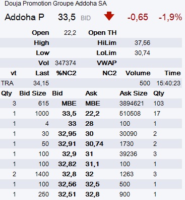 Vers 12h41, ce sont 510.508 titres qui étaient offerts à 22,2 DH. Vers 13h44, ce sont près de 4 millions titres qui étaient proposés au meilleur prix. A la clôture du 29 mars, Addoha cotait 34,15 DH.