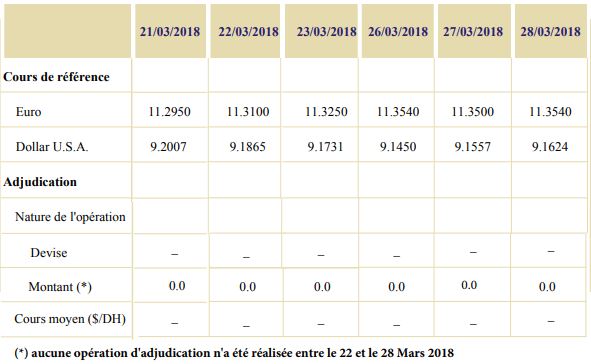Du 22 au 28 mars, aucune opération d’adjudication de devises n’a été réalisée sur le marché des changes, selon le dernier bulletin des indicateurs hebdomadaires publié par BAM.