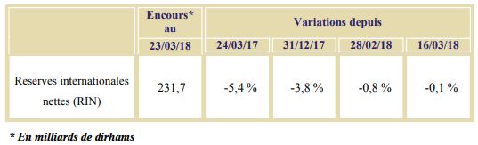 Pour leur part, les réserves internationales nettes (RIN) sont restées quasiment inchangées d’une semaine à l’autre, en affichant un encours de 231,7 milliards de DH (-0,1%) au 23 mars. En glissement annuel, elles se sont inscrites en baisse de 5,4%.