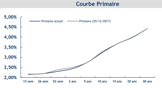Les rendements des bons à moyen terme ont suivi cette même tendance baissière : les bons de 2 ans et de 5 ans offrent un rendement de 2,44% et de 2,76% respectivement, en recul de 6,5 et 0,1 points de base par rapport à fin décembre 2017.