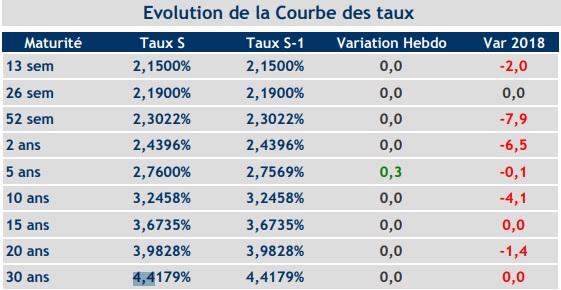 Concernant les bons du Trésor à 52 semaines, ceux-ci ont été cédés à 2,30%, en retrait de 7,9 points de base, soit la plus forte baisse enregistrée.