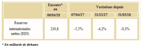 Selon la même source, les réserves internationales nettes (RIN) ont accusé une baisse de 0,3%, d’une semaine à l’autre, pour s’établir à 230,8 milliards de DH au vendredi 6 avril.