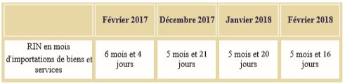 Les RIN en mois d’importations de biens et de services se situent à 5 mois et 16 jours à fin février 2018, contre 6 mois et 4 jours pendant la même période de l’année précédente.