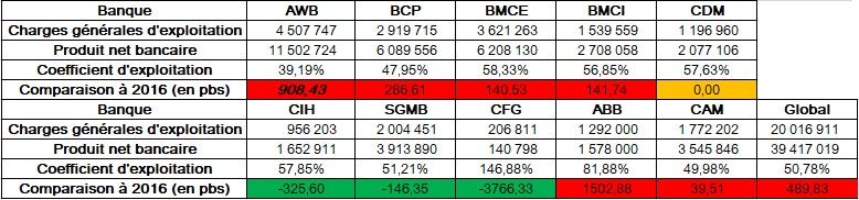 Et pour cause, l’augmentation des charges générales d’exploitation de près de 4,9%, à plus de 19 MMDH, contre une baisse du PNB global de 5,2%, impacté principalement par le retrait des PNB de BMCE BoA et d'Al Barid Bank, mais surtout par celui d’Attijariwafa bank qui a bénéficié en 2016 de l’opération stratégique avec la SNI concernant Wafa Assurance.